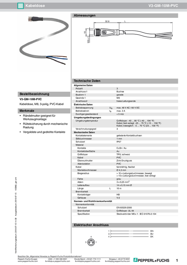 Pepperl+Fuchs 103362 Gniazdo kablowe M8 złącze żeńskie proste 10.00 m Ilość pinów: 3 1 szt.