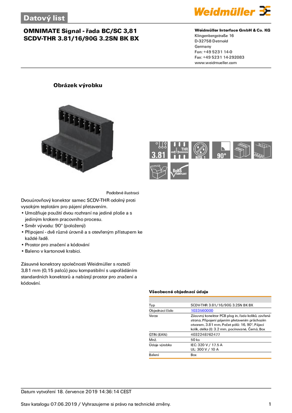 Weidmüller Obudowa złącza pin męskiego na PCB BC/SC Ilość pinów 18 Wymiary siatki: 3.81 mm 1033570000 50 szt.