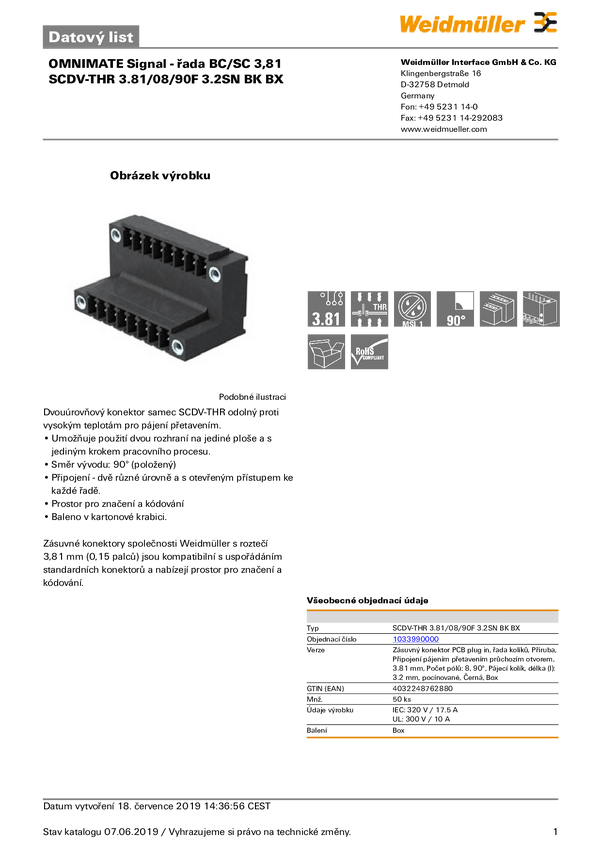 Weidmüller Obudowa złącza pin męskiego na PCB BC/SC Ilość pinów 8 Wymiary siatki: 3.81 mm 1033990000 50 szt.
