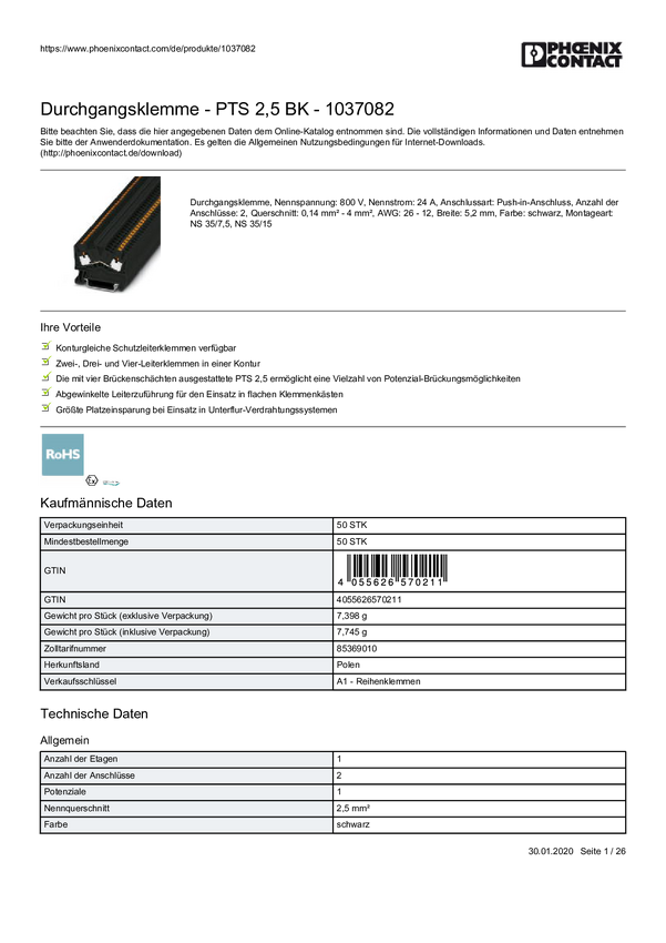 Terminal przepustowy Phoenix Contact 1037082 zacisk push-in 50 szt.
