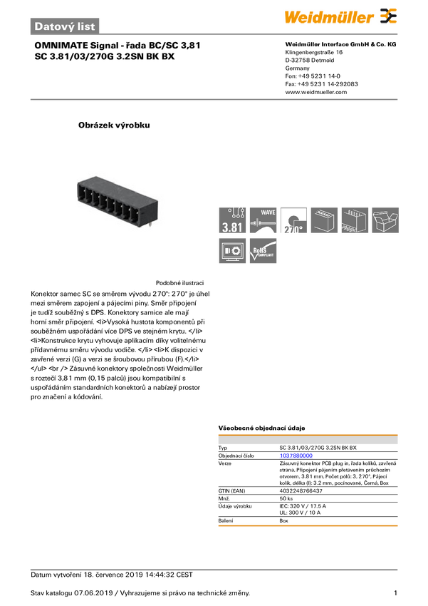 Weidmüller Obudowa złącza pin męskiego na PCB BC/SC Ilość pinów 3 Wymiary siatki: 3.81 mm 1037880000 50 szt.
