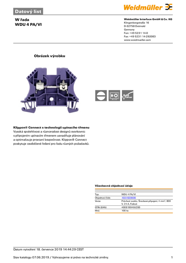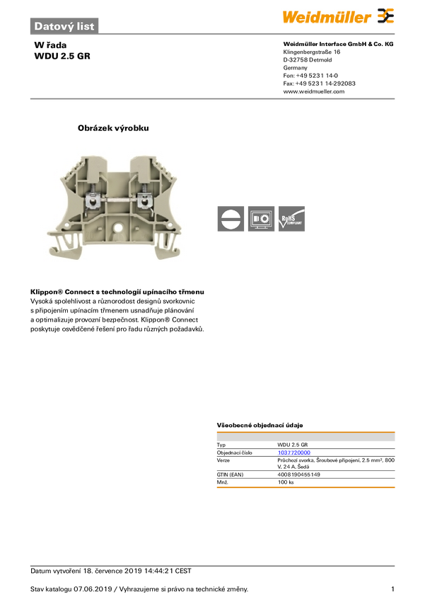 Seria W, Przelotowa rzędowa listwa zaciskowa, Przekrój pomiarowy: 2.5 mm², złącze śrubowe, montaż bezpośredni WDU 2.5 PA