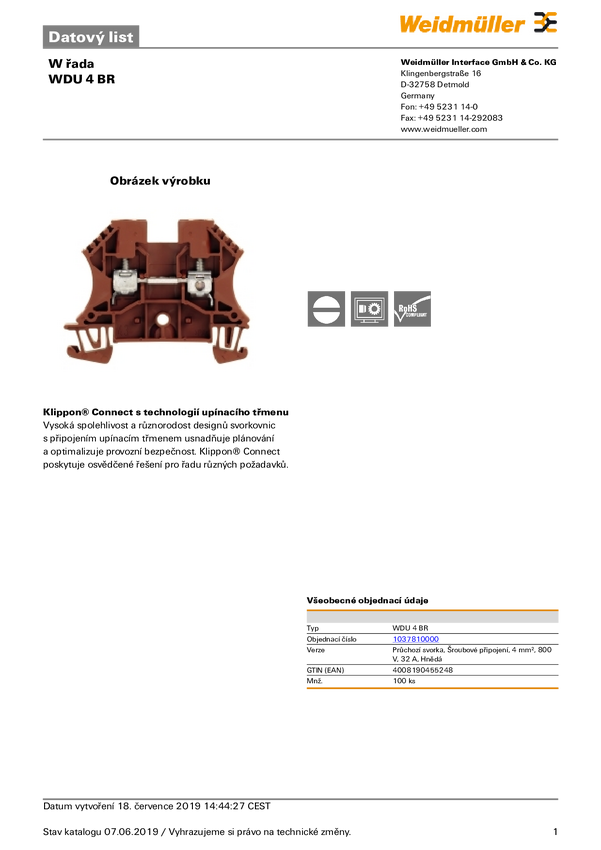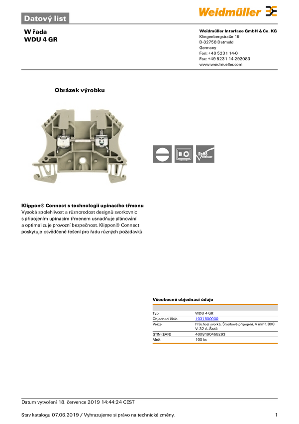 Seria W, Przelotowa rzędowa listwa zaciskowa, Przekrój pomiarowy: 2.5 mm², złącze śrubowe, montaż bezpośredni WDU 2.5 BR
