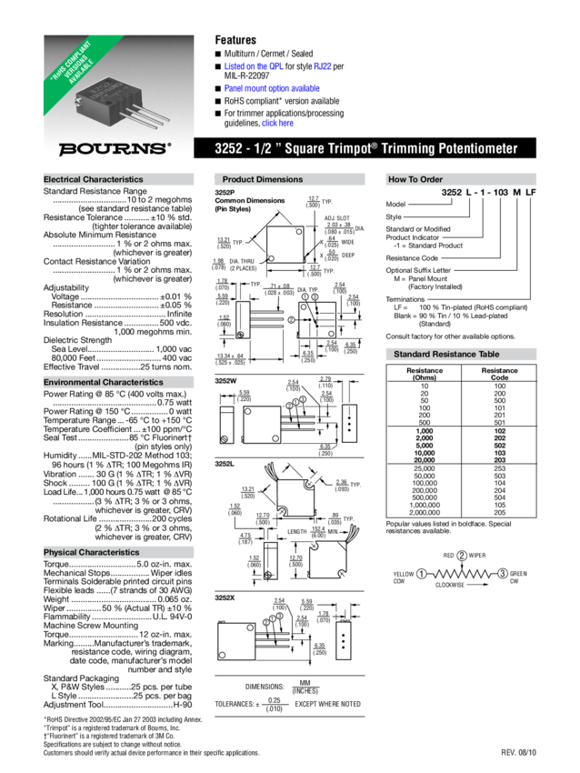 Res Cermet Trimmer 2K Ohm 10% 1/4W 12(Elec)Turn 1.78mm (7.37 X 4.32 X 6.35mm) Pin Thru-Hole Tube