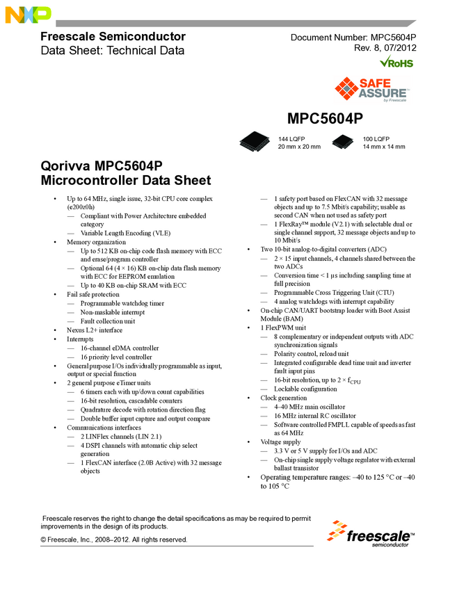 NXP 32-bit MCU, Power Arch core, 512KB Flash, 64MHz, -40/+105degC, Automotive Grade, QFP 144