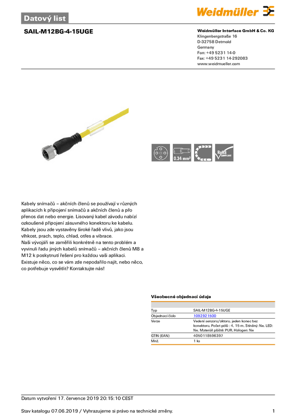 Weidmüller 1092921500 Złącze konfekcjonowane czujnika/aktuatora SAIL-M12BG-4-15UGE, piny: 4, 15.00 m, 1 szt.