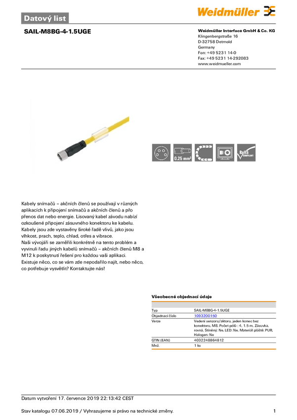 Przewód połączeniowy Weidmüller SAIL-M8BG-4-1.5QGE 1093200150 1 szt.