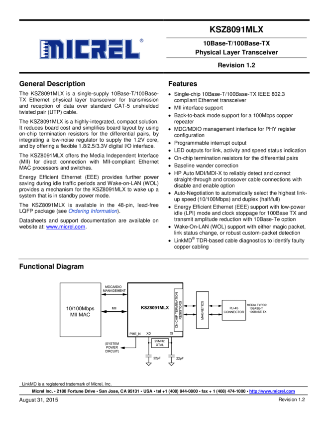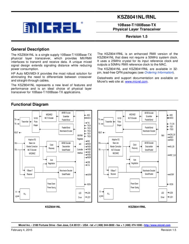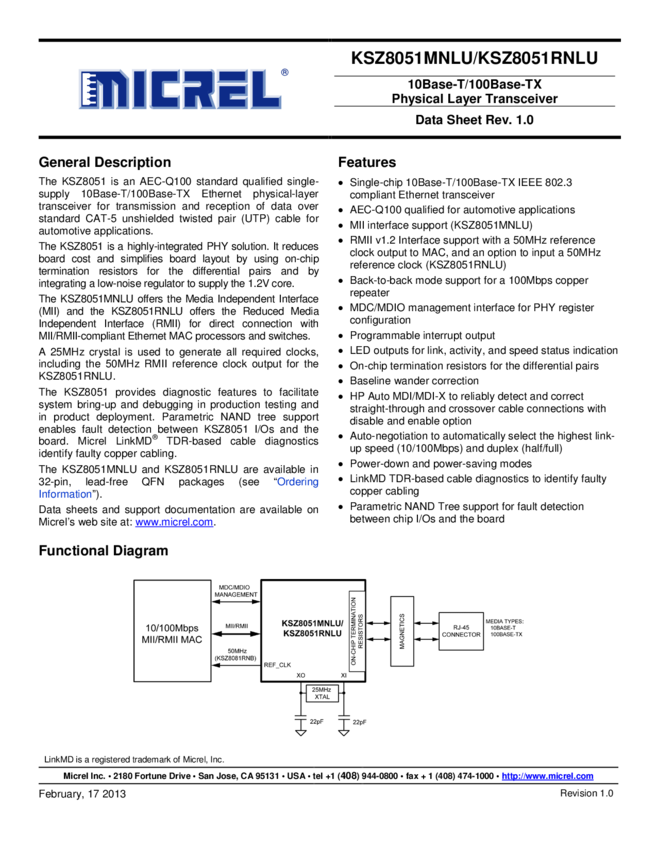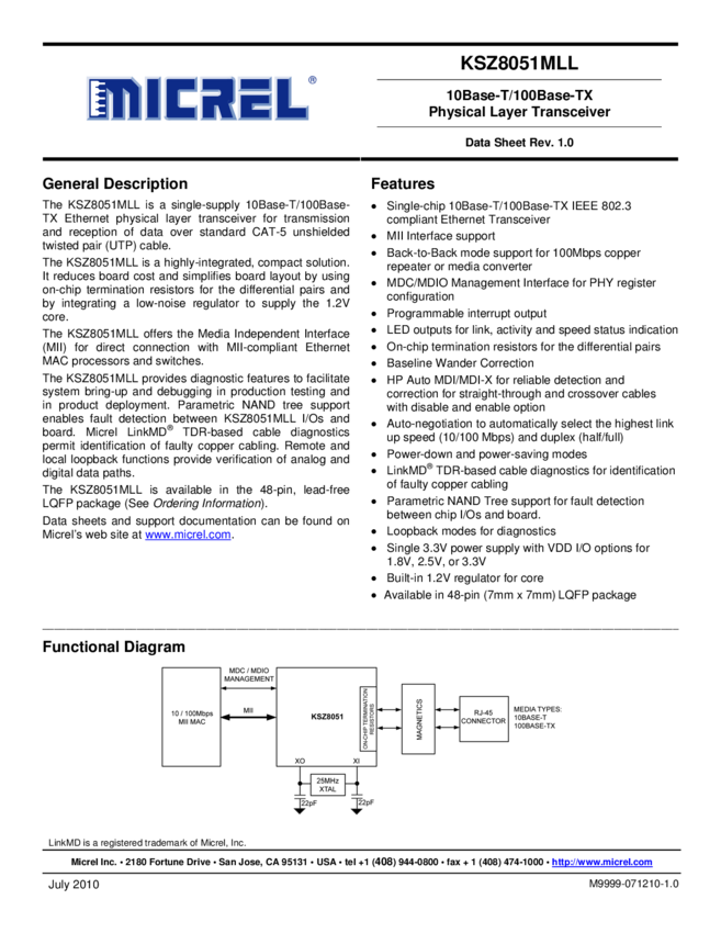 KSZ8051MNLU/RNLU - 10Base-T/100Base-TX PHY