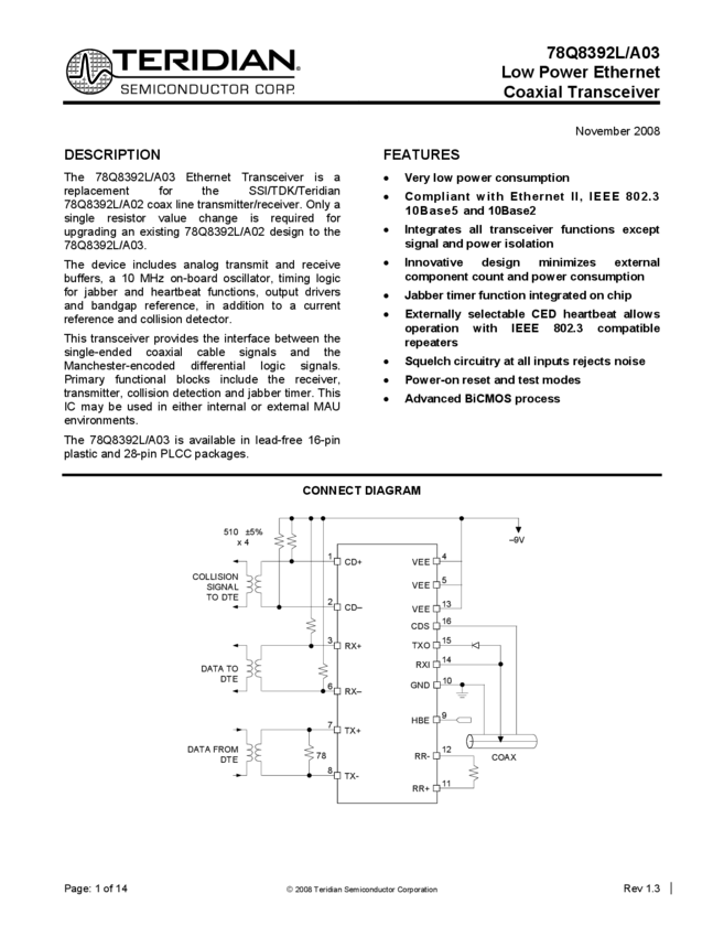 78Q8392LA03 10Base2/5 Ethernet Transceiver