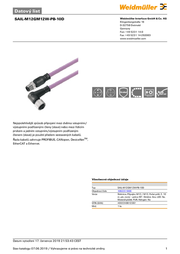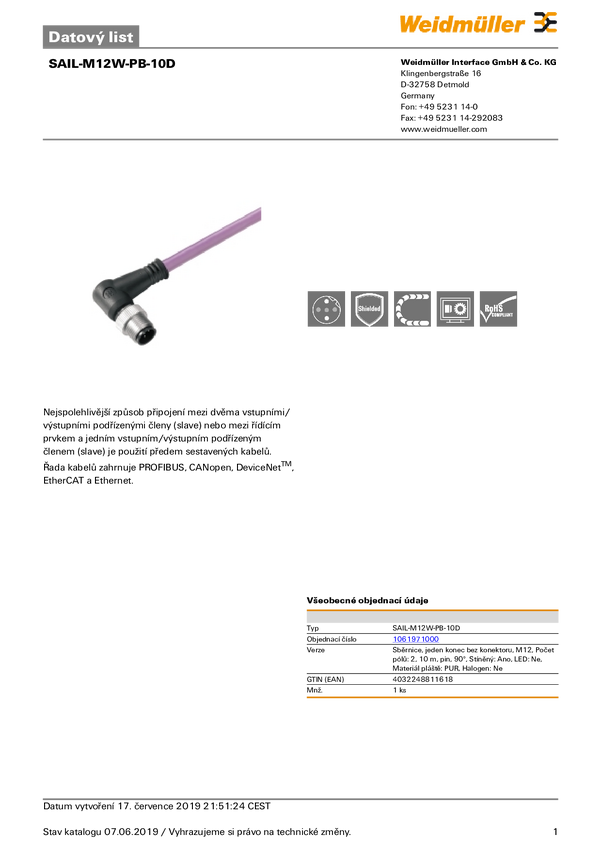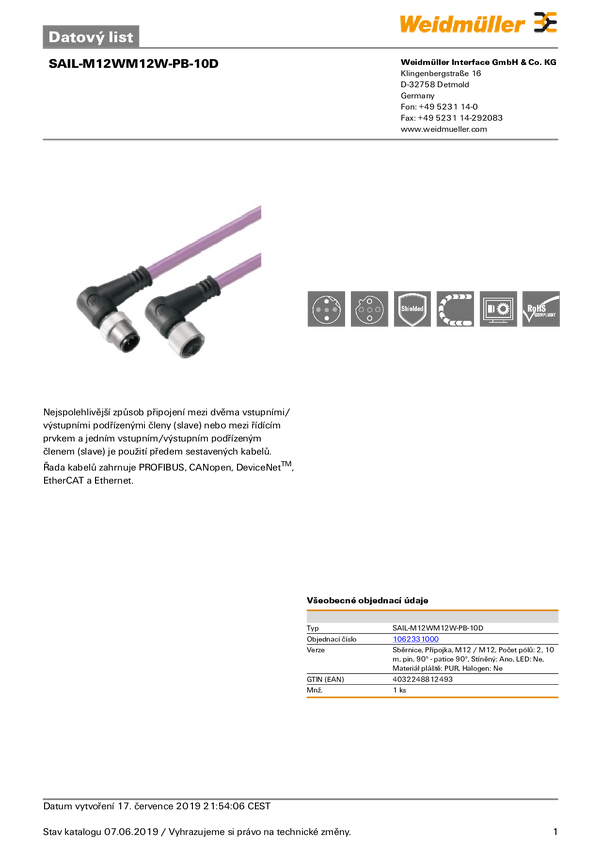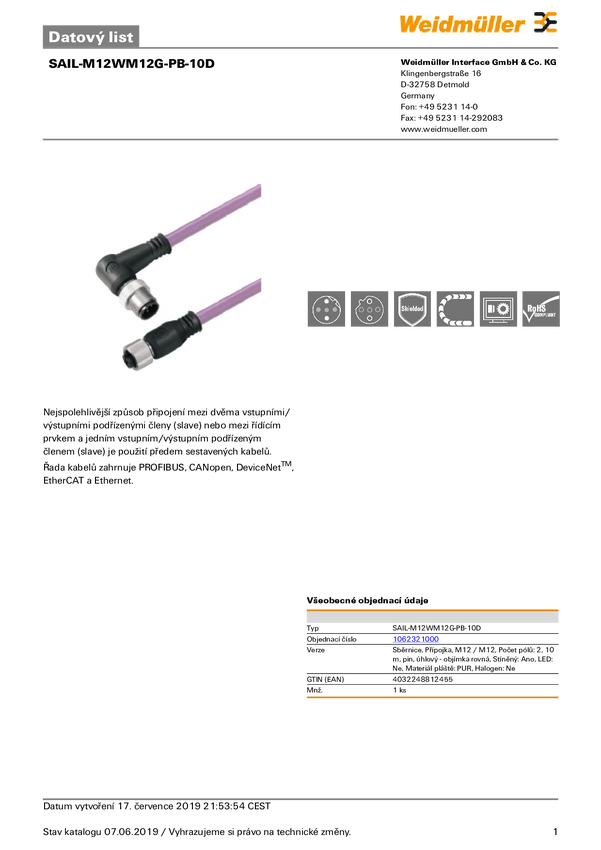 Przewód magistrali Weidmüller SAIL-M12W-PB-10D 1061971000 1 szt.