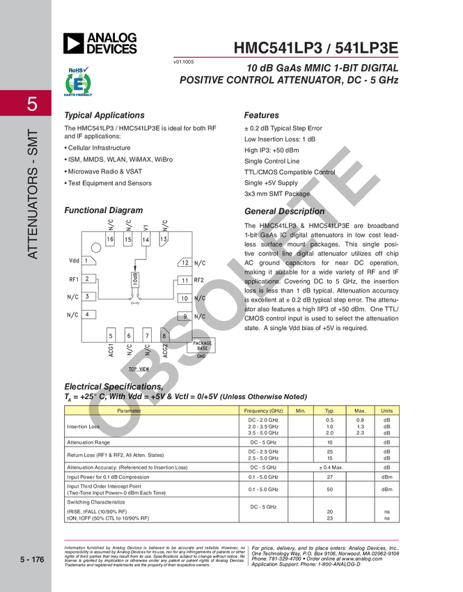10dB LSB 1-Bit Digital Attenuator SMT, DC - 5 GHz
