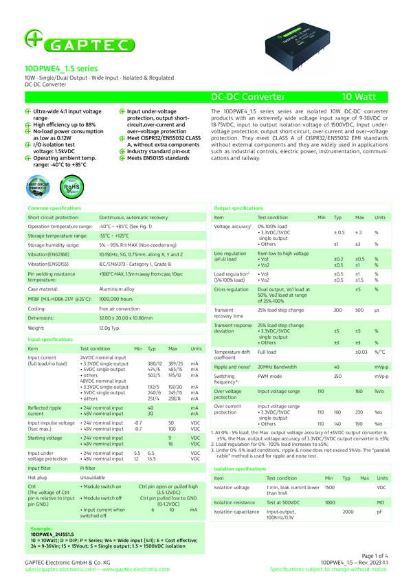 Gaptec 10DPWE4_4824S1.5 Przetwornica DC/DC 10DPWE4_1.5, DIP-24 (8 Pins), 10 W, 416 mA, 1 szt.