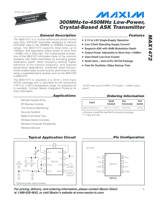 MAX1472 300MHz to 450MHz Low-Power, Crystal-Based ASK +10dBm Transmitter