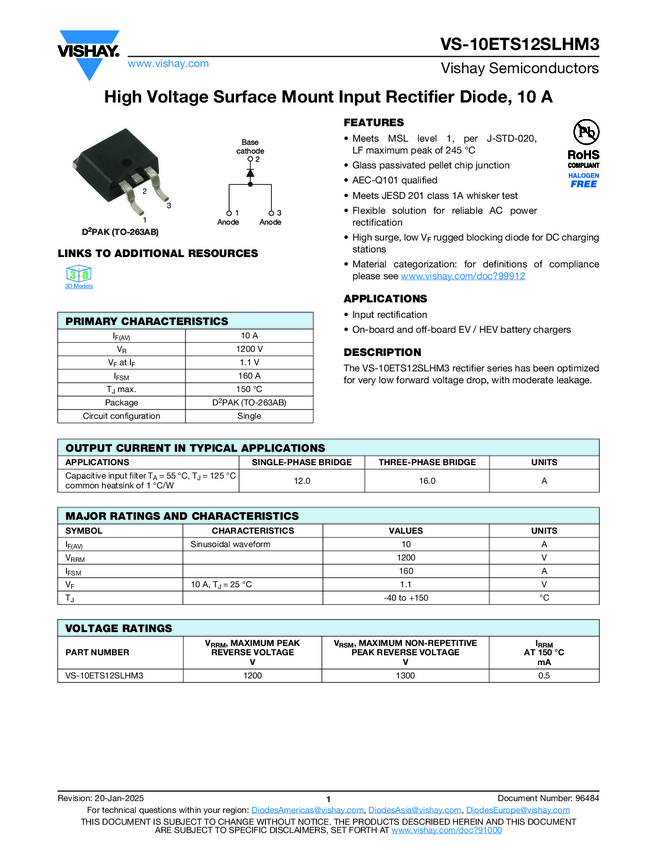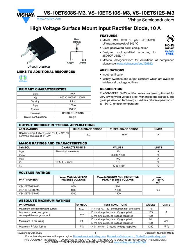 High Voltage Surface Mount Input Rectifier Diode, 10 A