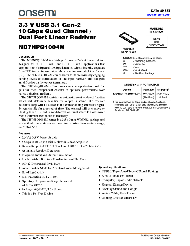 3.3 V USB 3.1 Gen-2 10Gbps Quad Channel / Dual Port Linear Redriver