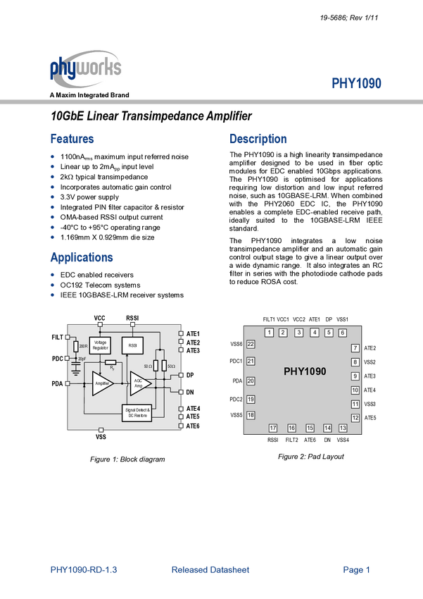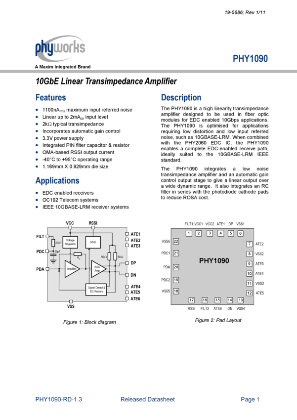 PHY1090 Linear 6G to 10Gbps Transimpedance Amplifier