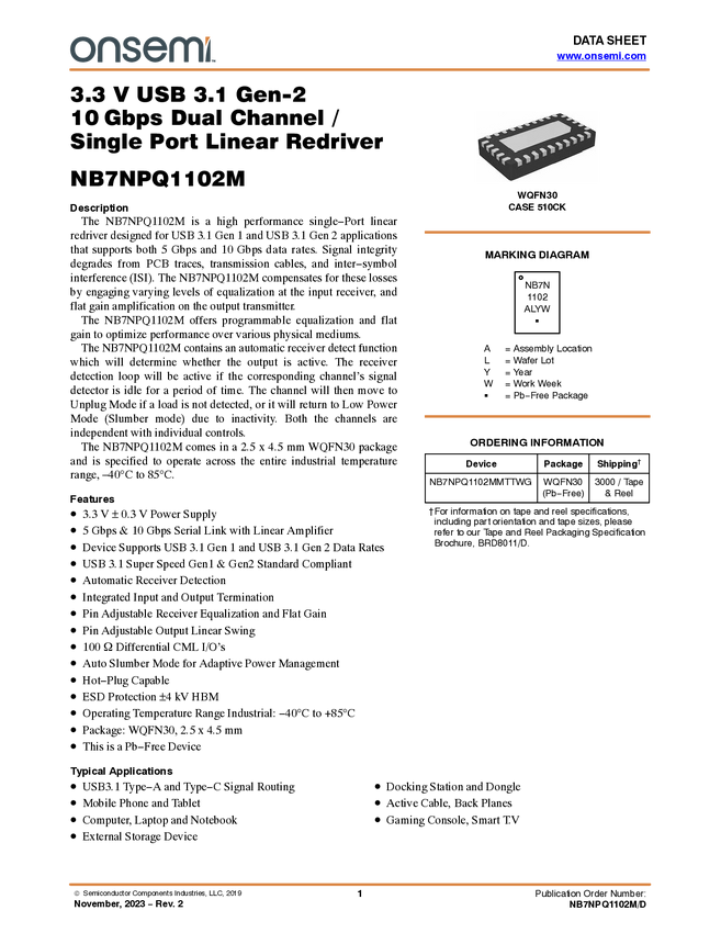 3.3 V USB 3.1 Gen-2 10Gbps Dual Channel / Single Port Linear Redriver