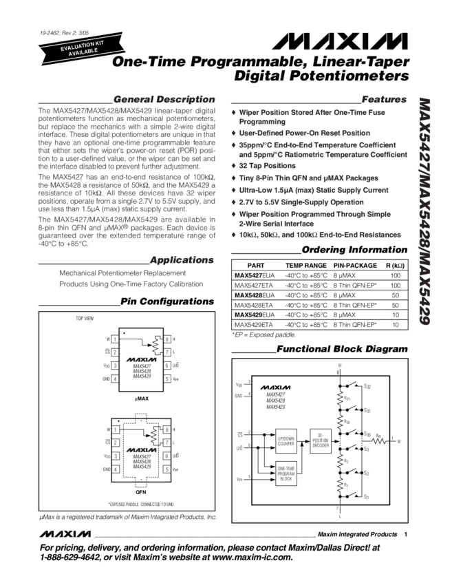 MAX5429 10k One-Time-Programmable Digital Potentiometer