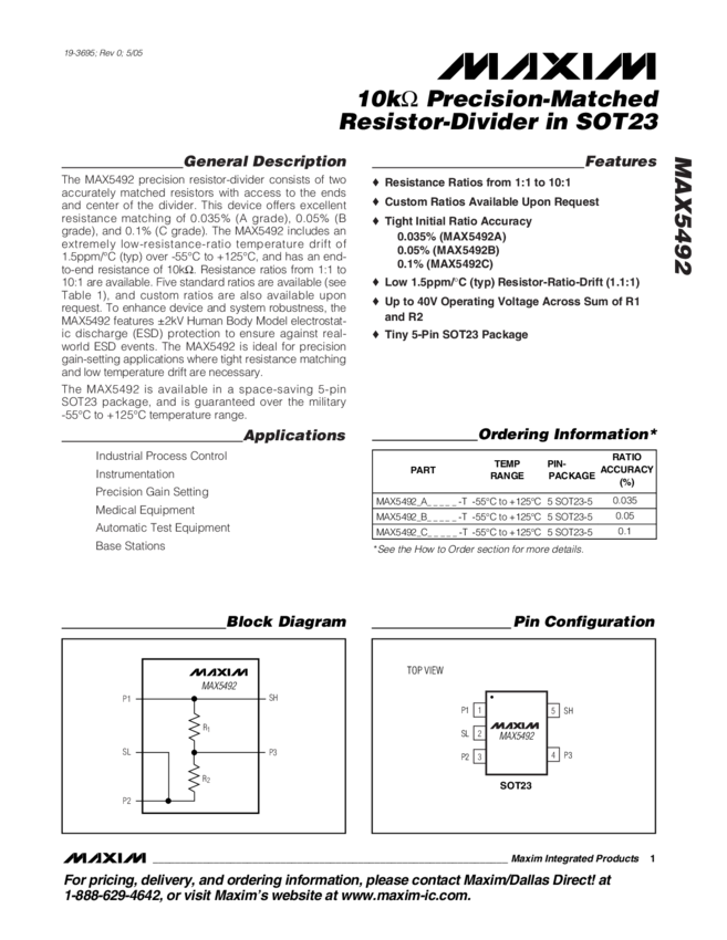 MAX5492 10k 2kV ESD Precision-Matched Resistor-Divider