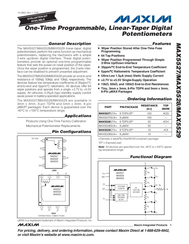 MAX5529 10k 64-Tap One-Time-Programmable Digital Potentiometer