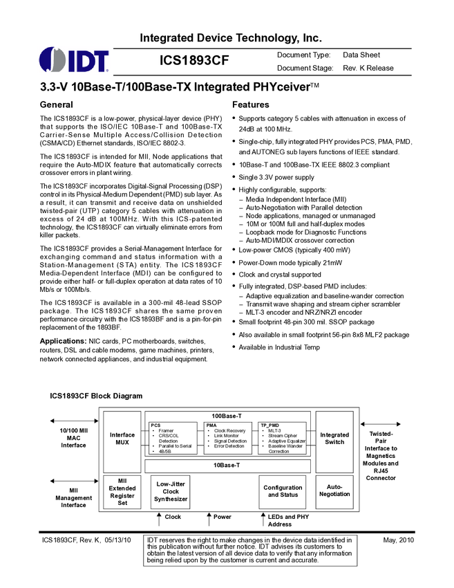 3.3-V 10Base-T/100Base-TX Integrated PHYceiver™