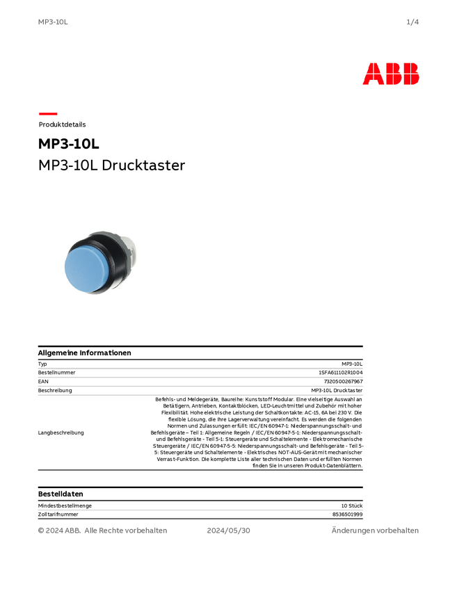 ABB 1SFA611101R1004 MP2-10L Przycisk niebieski 1 szt.