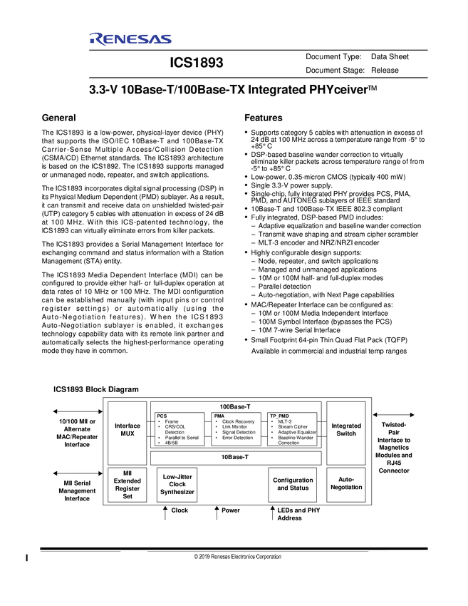 3.3V 10Base-T/100Base-TX Integrated PHYceiver