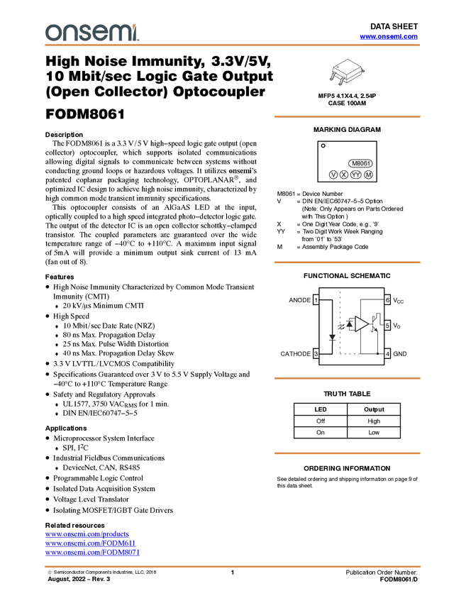 High Noise Immunity, 3.3V/5V, 10Mbit/sec Logic Gate Output (Open Collector) Optocoupler