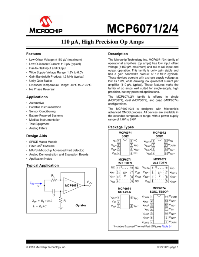 MCP6071/2/4, 110 µA, High Precision Op Amps (01/05/2011)