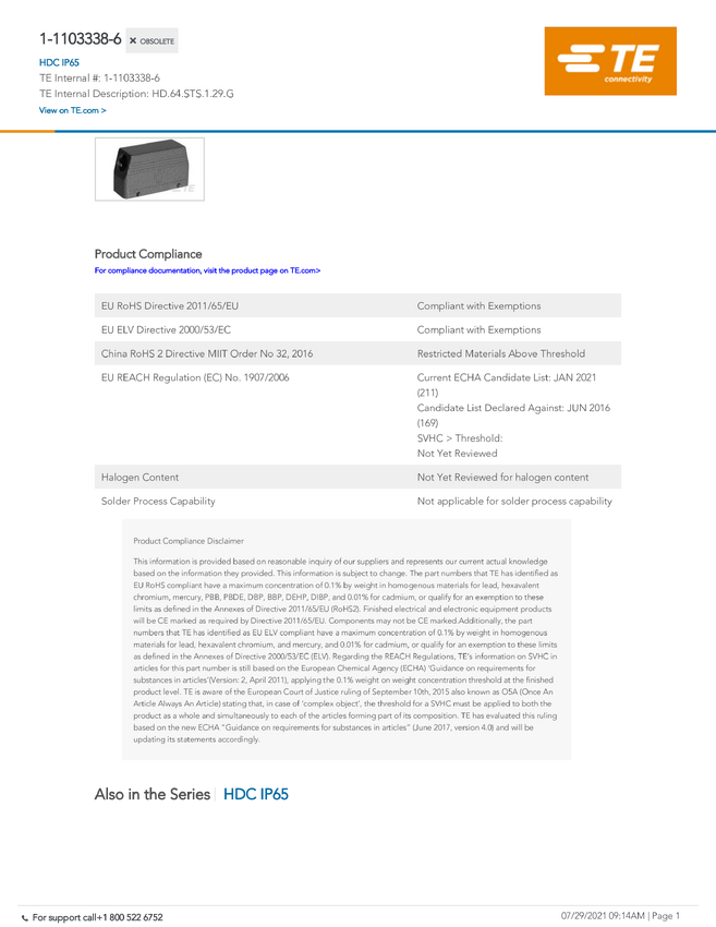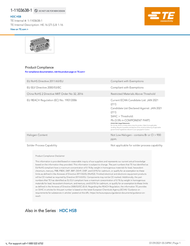 TE Connectivity 1-1103338-6 TE AMP HEAVY DUTY RECTANGULAR CONN, 1 szt.