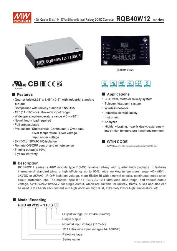 MW Mean Well RQB150W12-110S12 Przetwornica DC/DC 12 V 12.50 A 150 W Ilość wyjść: 1 x Content 1 szt.