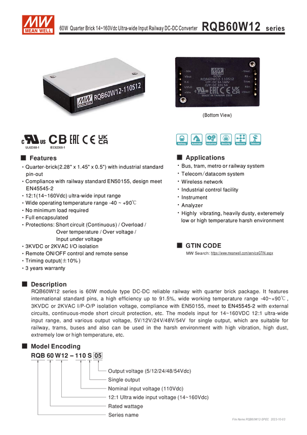 MW Mean Well RQB60W12-110S12 Przetwornica DC/DC, do PCB, 60 W, 12 V, 5 A, 1 szt.