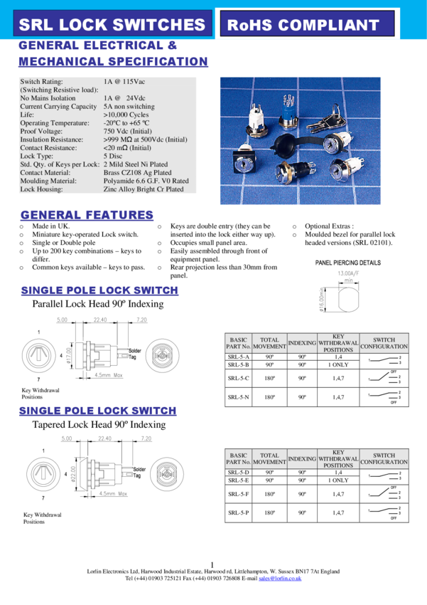 Switch Key Lock OFF None ON SPDT 90° Flat Key 1A 115VAC Solder Tag Panel Mount