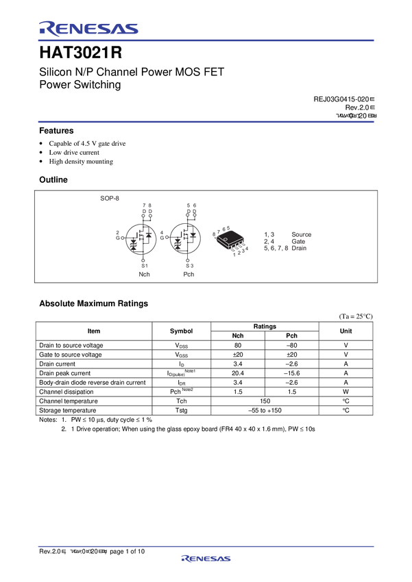 Nch/Pch Dual Power Mosfet 80V 3.4A 115Mohm Sop8