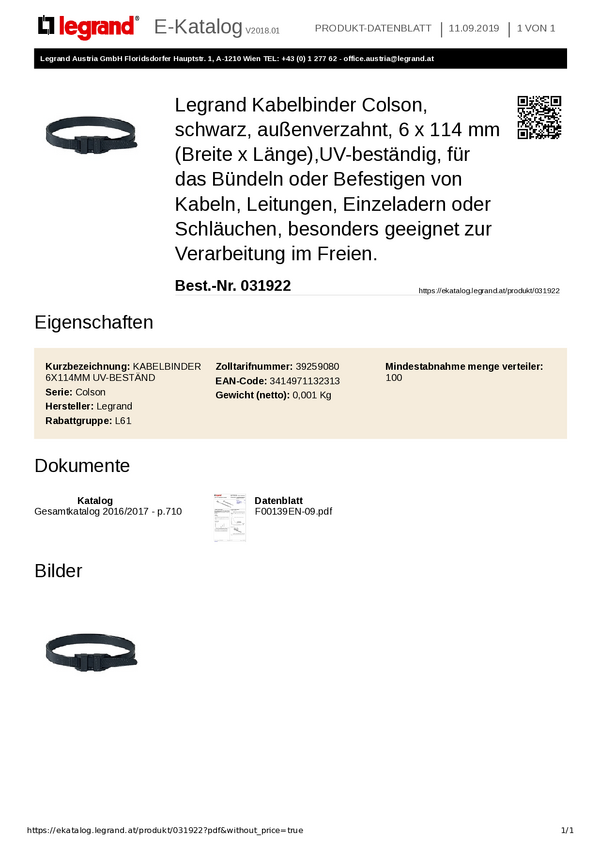 Opaska kablowa Legrand Legrand 031922 031922, 119 mm, tworzywo sztuczne, 100 szt.