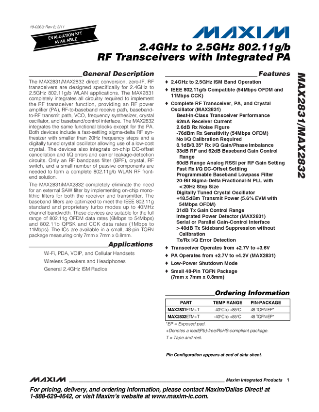 MAX2830 2.4GHz to 2.5GHz 802.11g/b RF Transceiver with PA and Rx/Tx/Diversity Switch