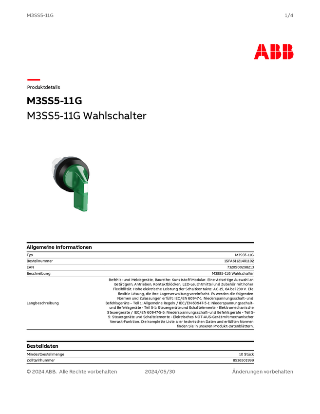 ABB 1SFA611215R1102 M3SS6-11G Podświetlany przełącznik wybierakowy przełącznik obrotowy 1 szt.
