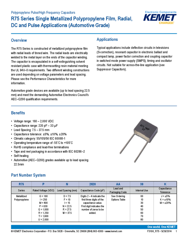 Cap Film 0.0022uF 2000V PP 10% (18 X 5 X 11mm) Radial 15mm 105°C T/R