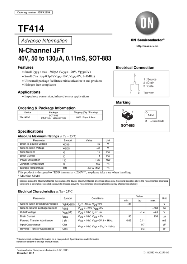 N-Channel JFT, 40V, 50 to 130µA, 0.11mS, SOT-883