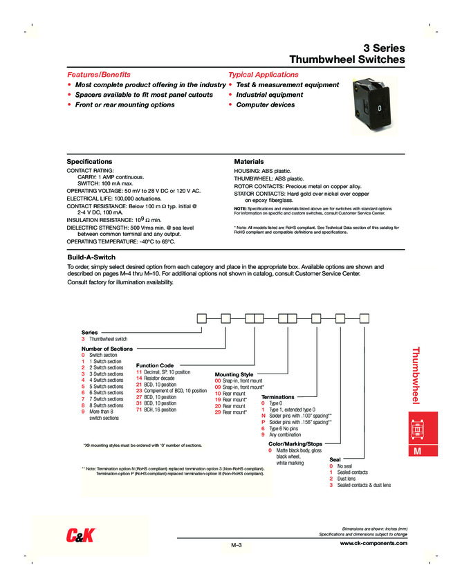 Switch Thumb-Pushwheel Thumbwheel BCD 10 0.1A 120VAC 28VDC Solder Pins Panel Mount/Through Hole