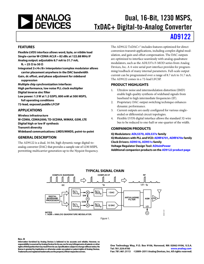 AD9122: Dual, 16-Bit, 1200 MSPS, TDAC+® Digital-to-Analog Converter
