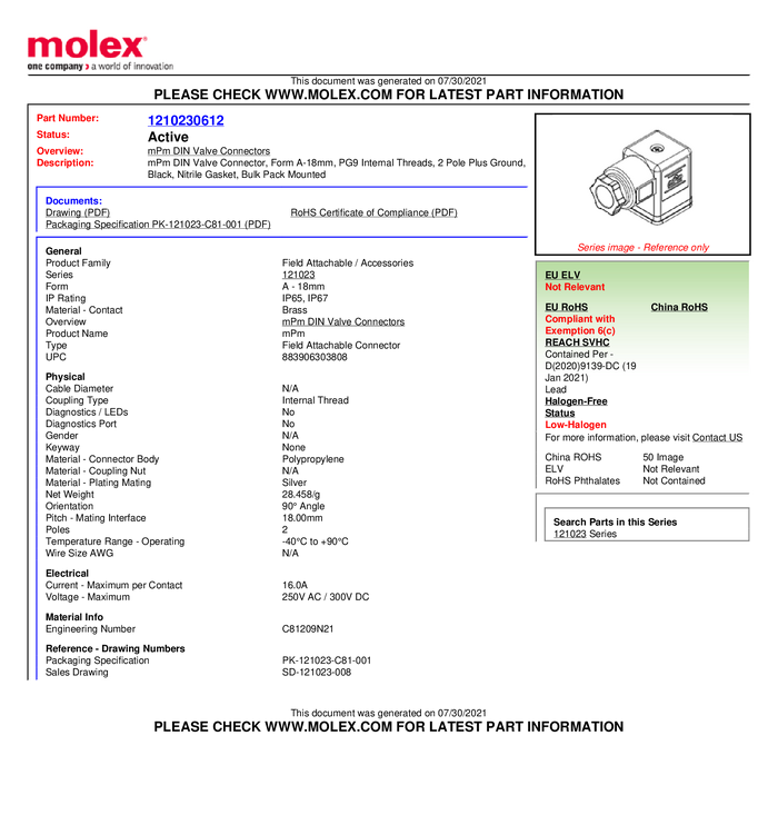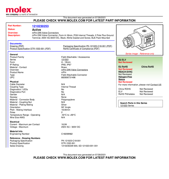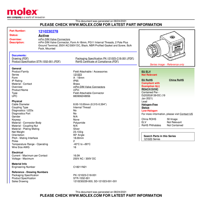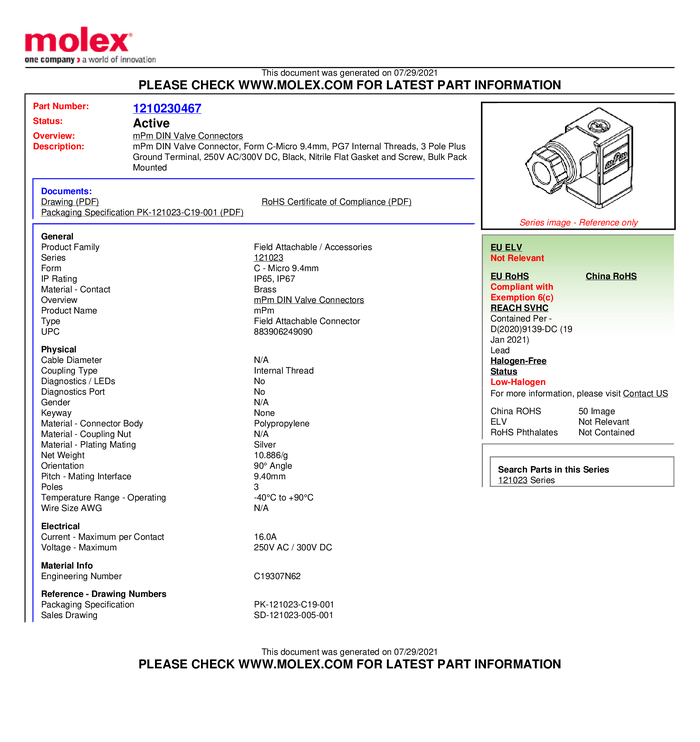 Molex 1210230467 Złącze zaworowe Molex WOD Industrial Solution, C standard, 250 V/AC, 300 V/DC, IP65, IP67, 1 szt.