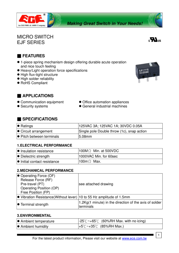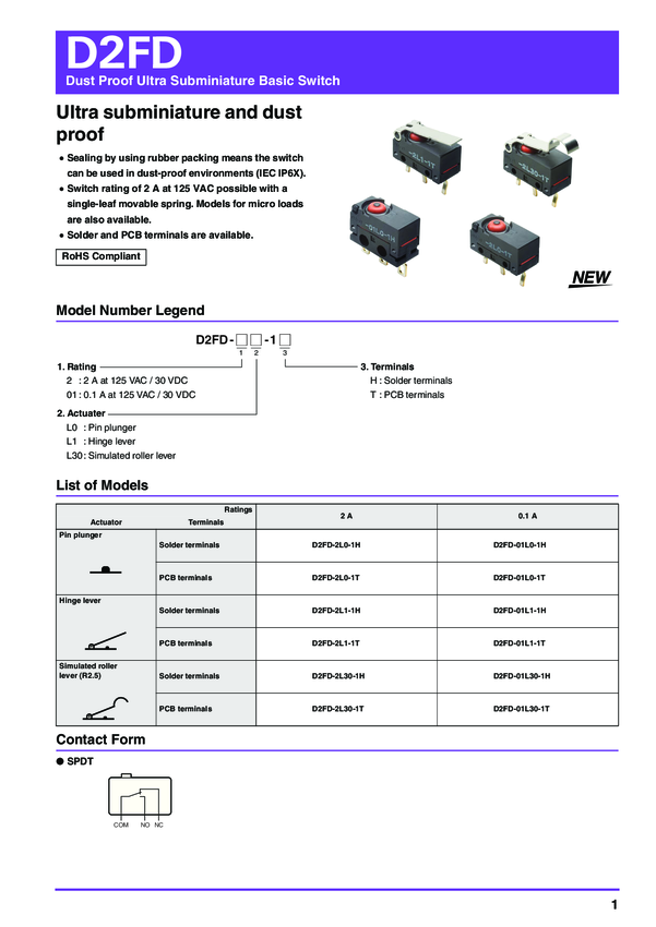 Sub-miniaturowy mikroprzełącznik z dźwignią, 1A/125VAC, z małą siłą nacisku, EXCEL