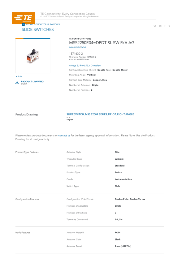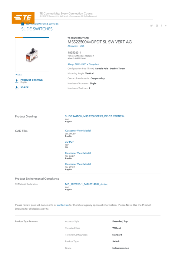Switch Slide DPDT Extended Top Slide 0.3A 125VAC PC Pins Bracket Mount/Through Hole