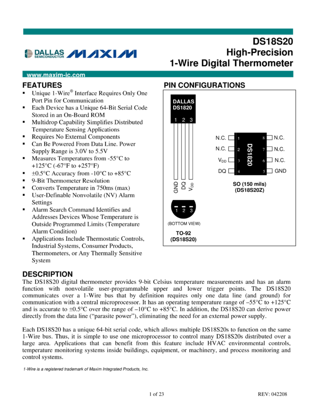 Cyfrowy czujnik z interfejsem 1-Wire, rozdzielczość 9-12 bit, TO-92, -55/+125C