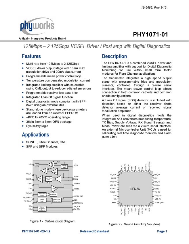PHY1071 125Mbps to 2.125Gbps VCSEL Driver/Postamp with Digital Diagnostics