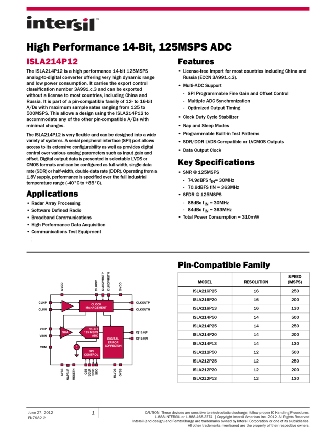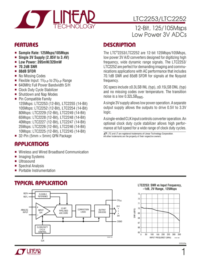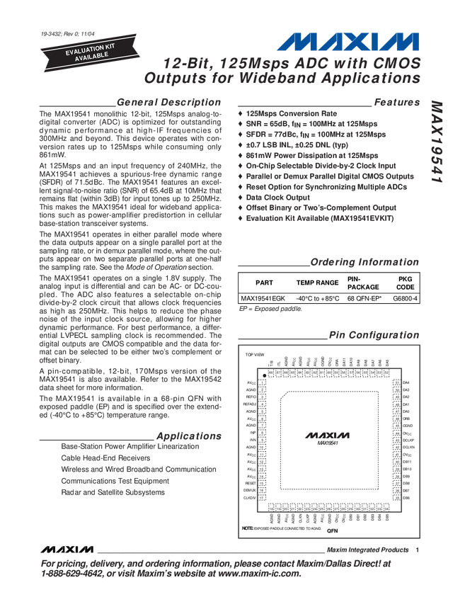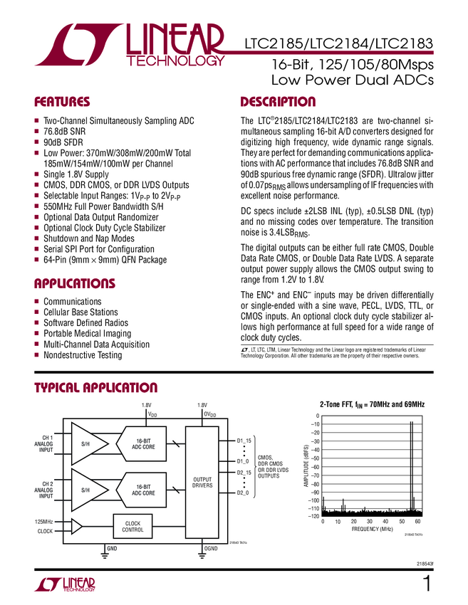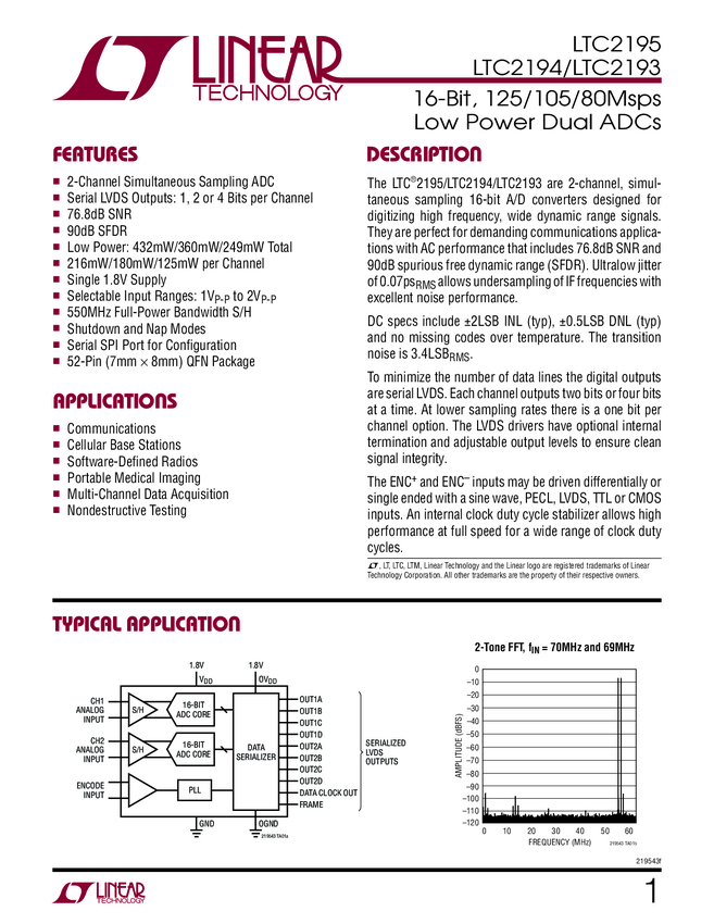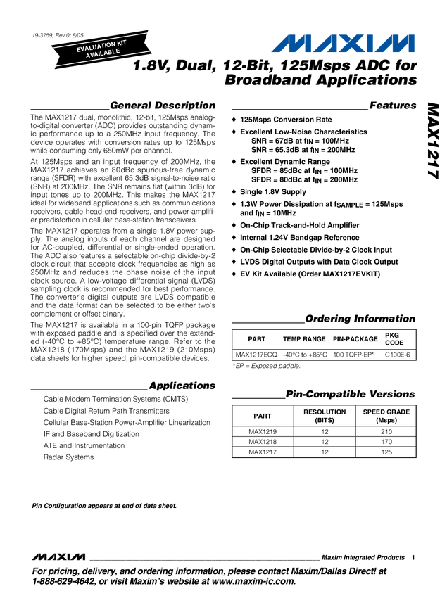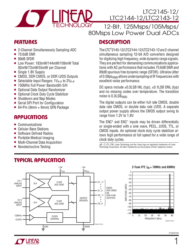 1.8V, Dual, 12-Bit, 125Msps ADC for Broadband Applications
