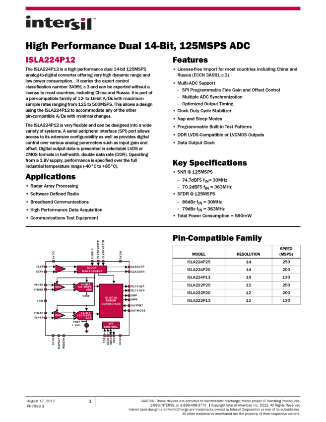 Dual 12-Bit, 125Msps Low Power 3V ADC
