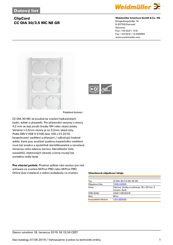 Weidmüller 1266140000 CC DIA 30/3.5 MC NE GR Tabliczka znamionowa Sposób montażu: opaska kablowa Pole powierzchni etykie