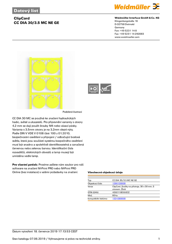 Tabliczka znamionowa Weidmüller CC DIA 30/3.5 MC NE GE 1266130000, montaż: opaska kablowa, 30 x 30 mm, 60 szt.